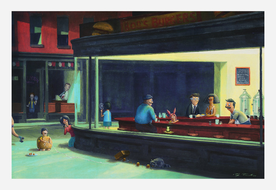 A Classic with Cheese is a reimagining of Edward Hopper’s iconic Nighthawks featuring Bobs Burgers characters. We have a print of this in our apartment.